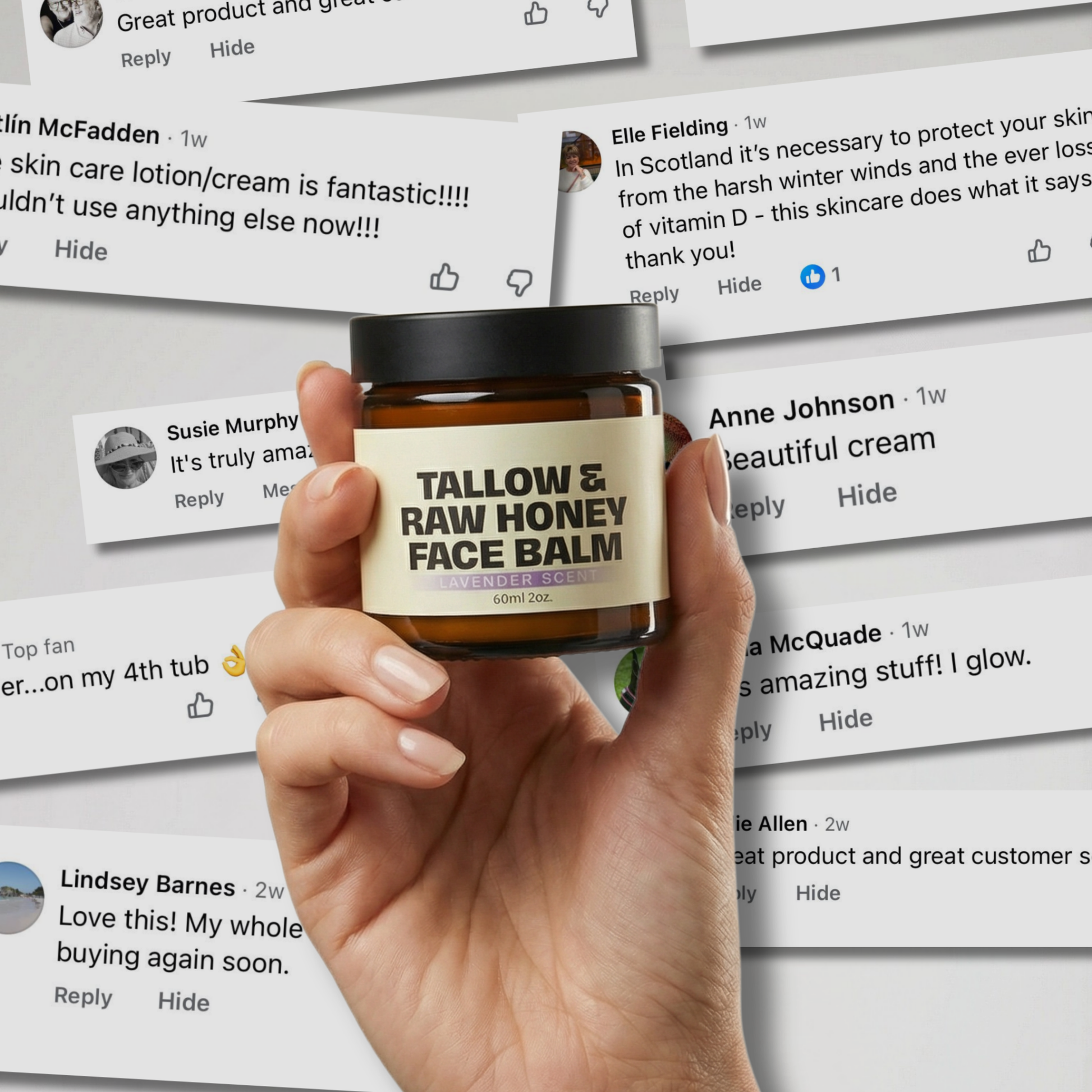 Love Tallow & Raw Honey facebalm. Makes my skin feel so soft and plumped up. Easy to apply - just warm it a wee bit in your hands. Great for any rough areas- elbows and hands too.